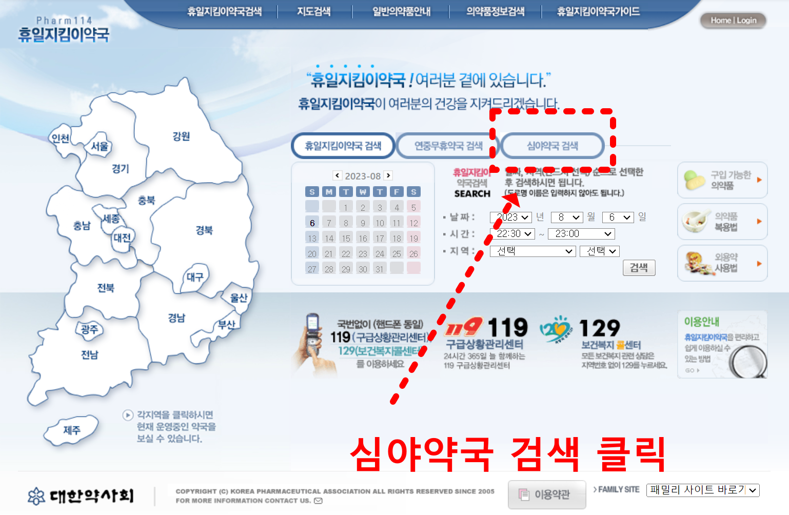 2. 휴일지킴이약국 홈페이지 메인에서 심야 약국을 검색 합니다.