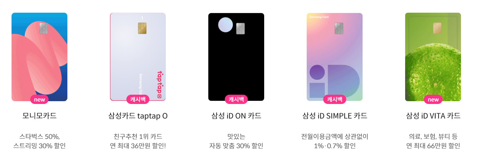 신용카드: 삼성카드는 다양한 종류의 신용카드를 발급합니다. 이러한 신용카드는 소비자들에게 다양한 혜택과 할인을 제공하며, 일상적인 소비나 여행, 엔터테인먼트 등 다양한 분야에서 사용할 수 있습니다.
